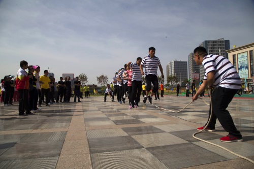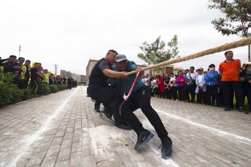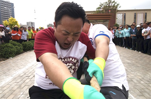 隨著一聲哨響,拔河比賽正式開始,比賽中參賽隊(duì)員雙手緊握長繩,大家都鉚足了勁兒、全力拼博,隨著長繩子上紅色錘線的左右移動(dòng),場外加油聲、吶喊聲、歡呼聲連成一片,場面蔚為壯觀。