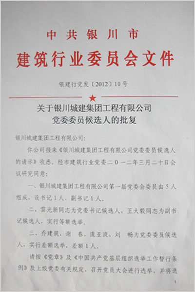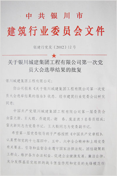 銀川市建筑行業(yè)黨委的批復(fù)